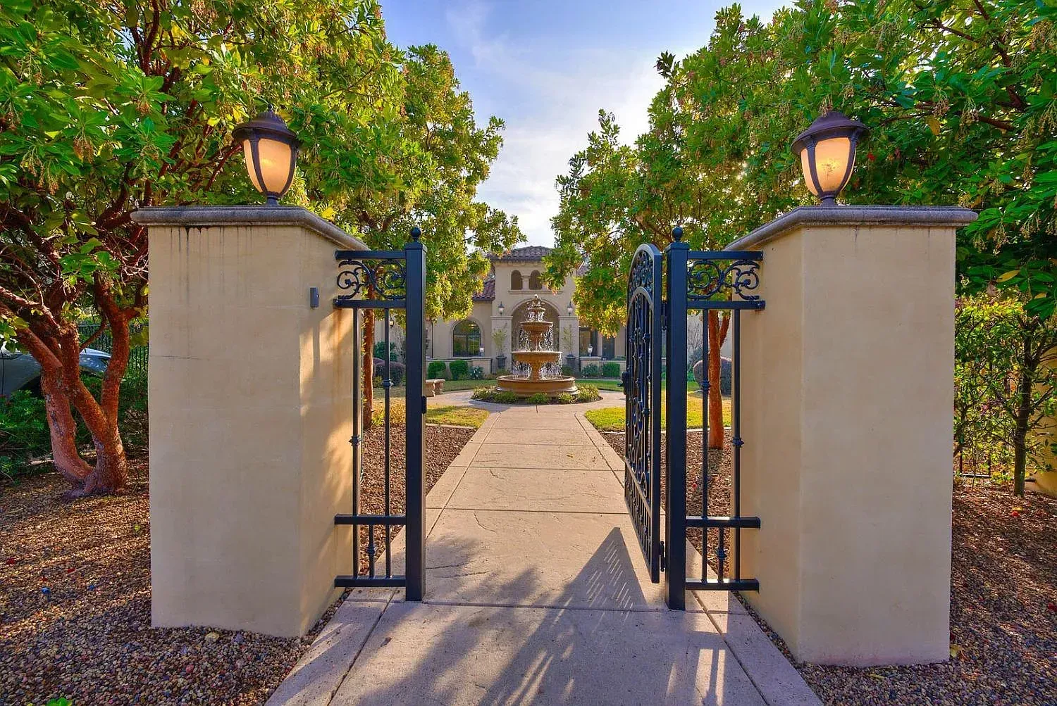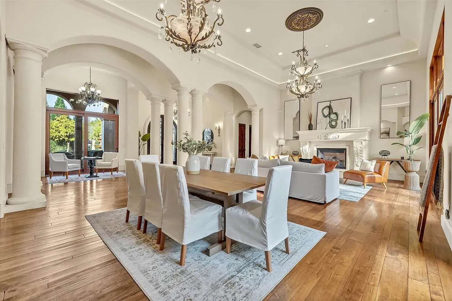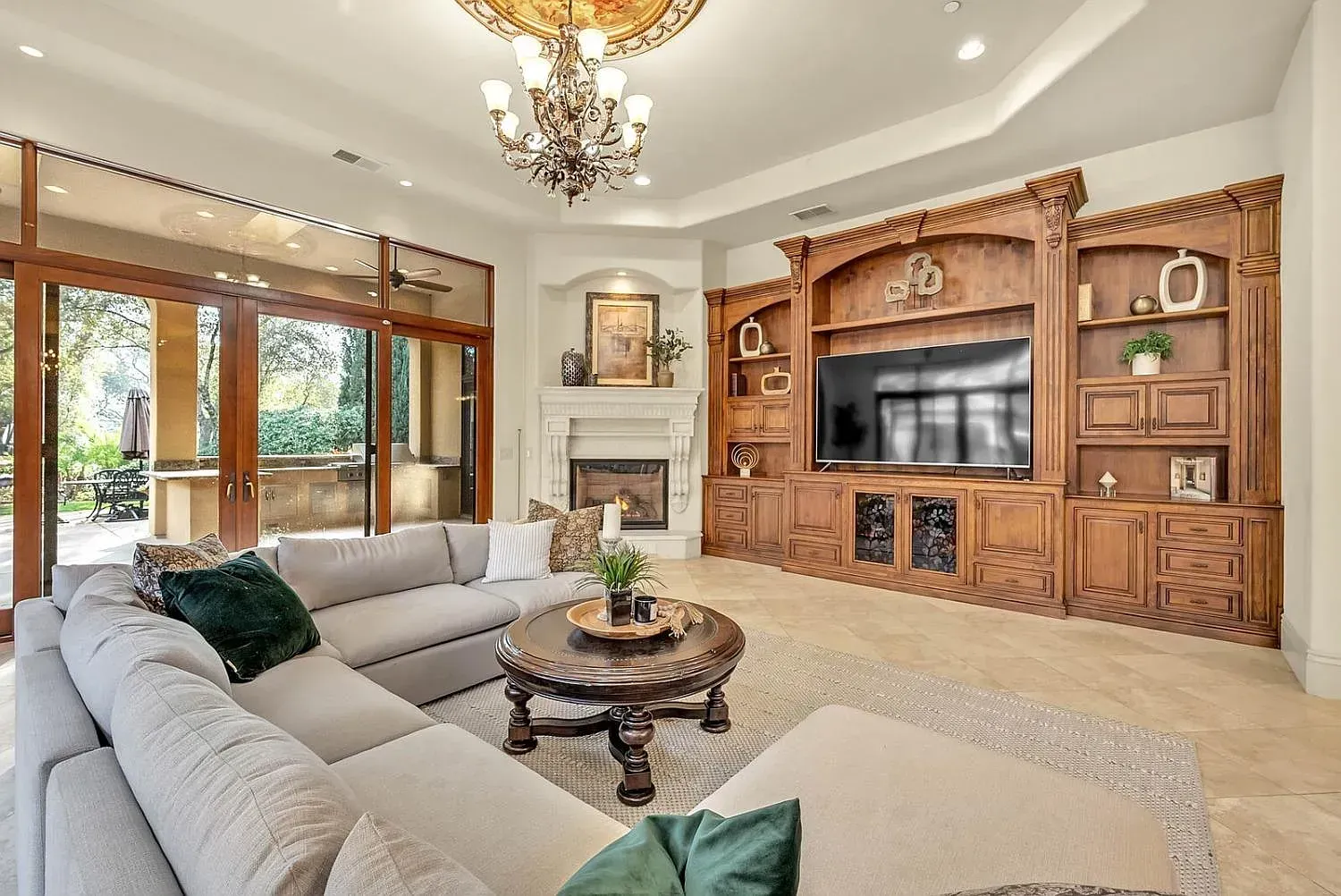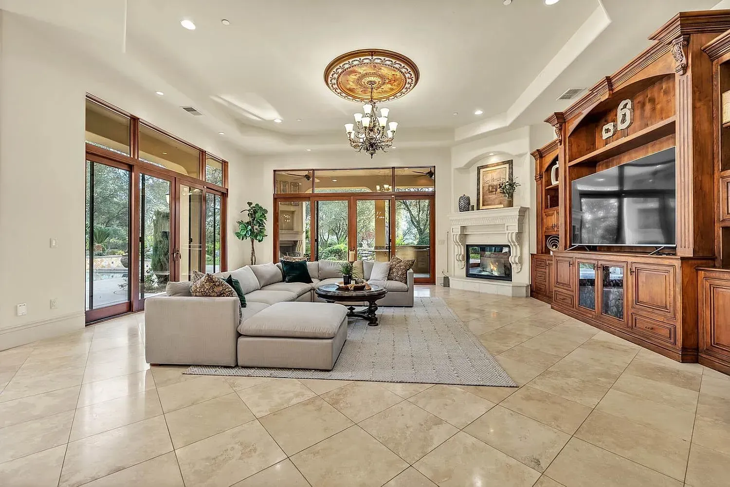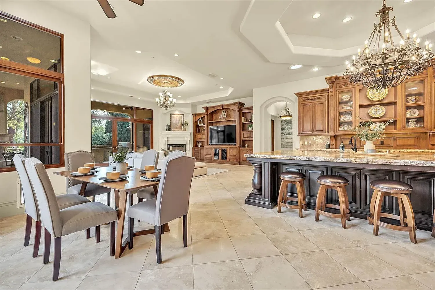 In the exclusive Terracina gated community, this estate spans over 3 pristine acres. The 7,800 +/- sq ft residence, with primary living on one level, offers sophisticated comfort featuring 5-6 bedrooms, a bonus room, office, retreat, and 6 full plus 4 half baths. Its thoughtful floor plan seamlessly connects elegant formal spaces to relaxed family areas. Entertain in the gourmet chef's kitchen with an adjoining back kitchen for catering, or unwind in the resort-style backyard with a pool, built-in BBQ, fireplace, bathroom, and outdoor shower. The main-floor primary suite is a serene retreat with a fireplace and direct yard access. A spectacular bonus room includes a wine cellar, fireplace, and custom bar. The home office boasts custom built-ins, and the 6-car garage delights automotive enthusiasts with cabinetry and a bathroom. An upstairs retreat with en-suite, wet bar, and office is ideal for guests or multigenerational living. Owned solar ensures low utility costs. Meticulously curated, this estate beautifully blends luxury, comfort, and sustainability.